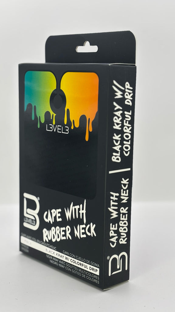 L3VEL3 Professional Rubber Neck Cutting Cape in the "Black Kray w/ Colorful Drip" design. This is a professional barber and hairstylist accessory designed to provide superior client protection during haircuts and chemical services.