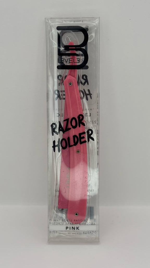 L3VEL3 Straight Razor Holder in pink. It is designed for professional barbers, offering precision and control for shaving and intricate detail work on facial hair or scalps.
