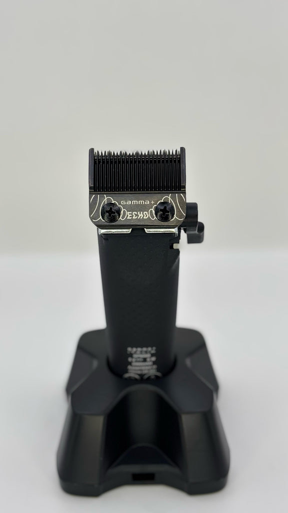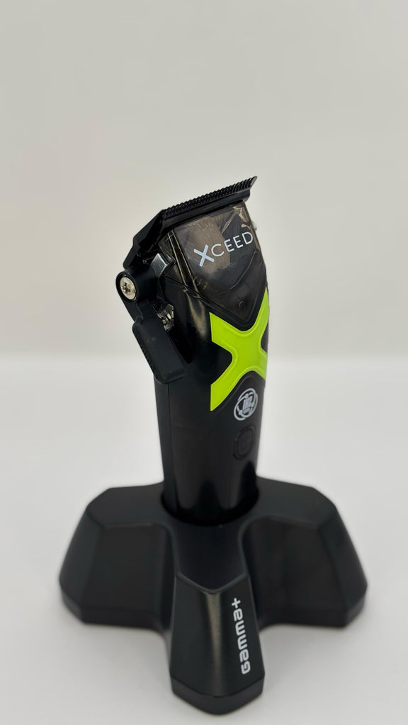 The device pictured is the Gamma+ Xceed Professional Cordless Hair Clipper. This clipper is part of the professional Xceed lineup designed for barbers and stylists. It operates on a charging dock and can also be recharged via a universal USB-C connection.